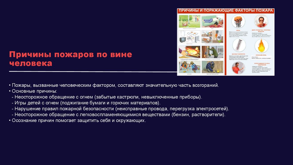 • Пожары, вызванные человеческим фактором, составляют значительную часть возгораний.