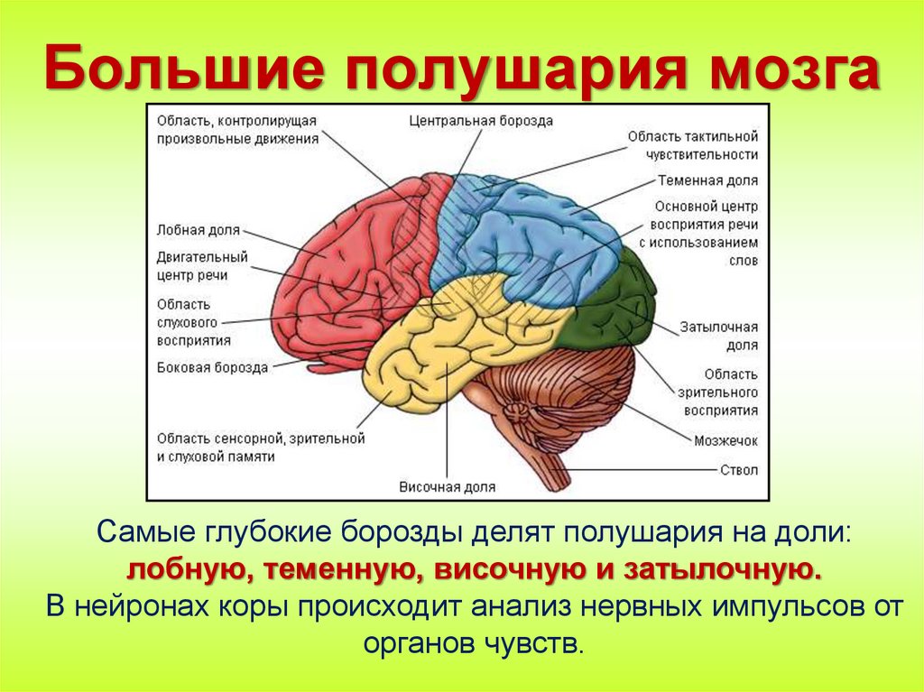 Большие полушария мозгаСамые глубокие борозды делят полушария на доли: