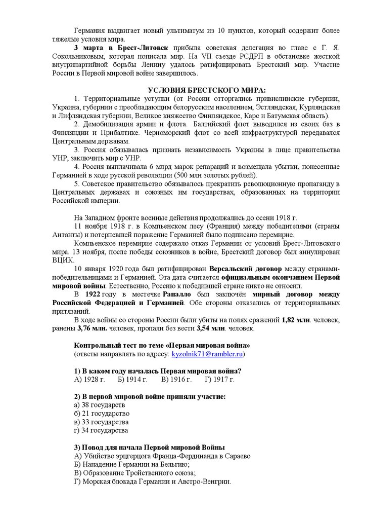8) Какая из стран Антанты подписала Сепаратный мир с Германией?