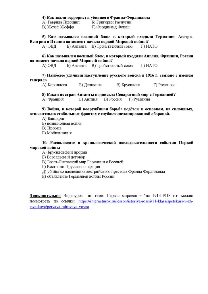 Дополнительно: Видеоурок по теме: Первая мировая война 1914-1918 г.г. можно