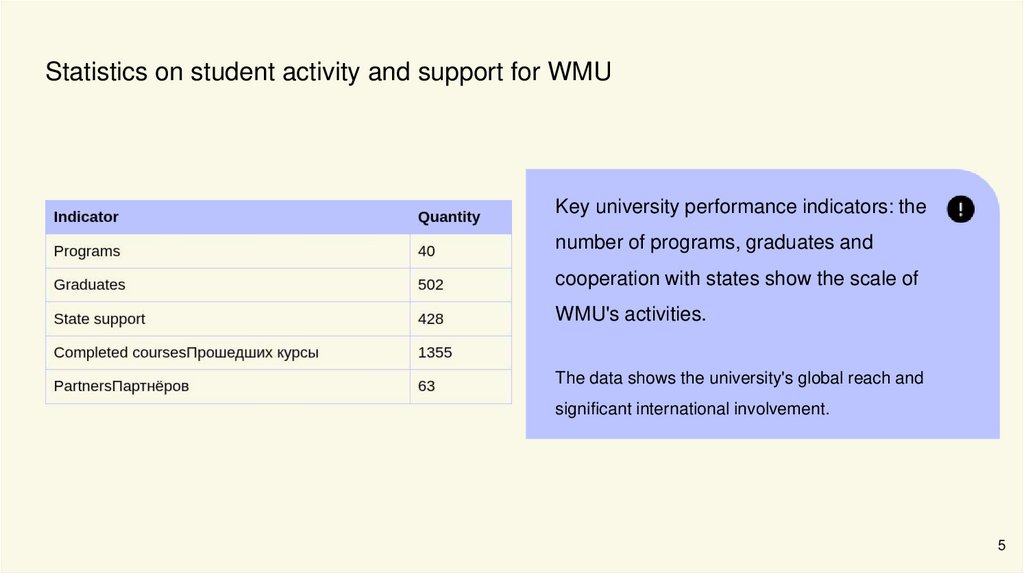 Statistics on student activity and support for WMUKey university performance indicators: the