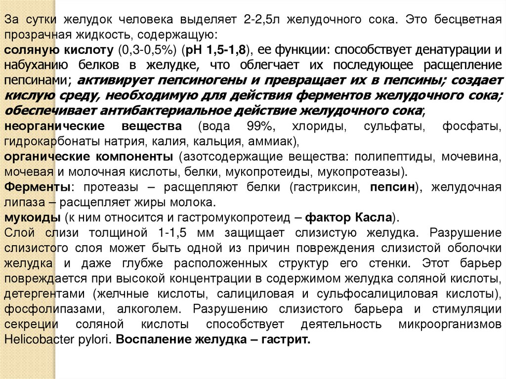 За сутки желудок человека выделяет 2-2,5л желудочного сока. Это бесцветнаяпрозрачная жидкость, содержащую: