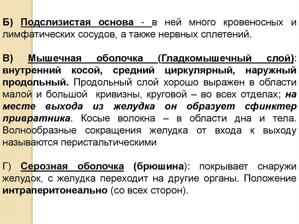 Б) Подслизистая основа - в ней много кровеносных илимфатических сосудов, а также нервных сплетений.