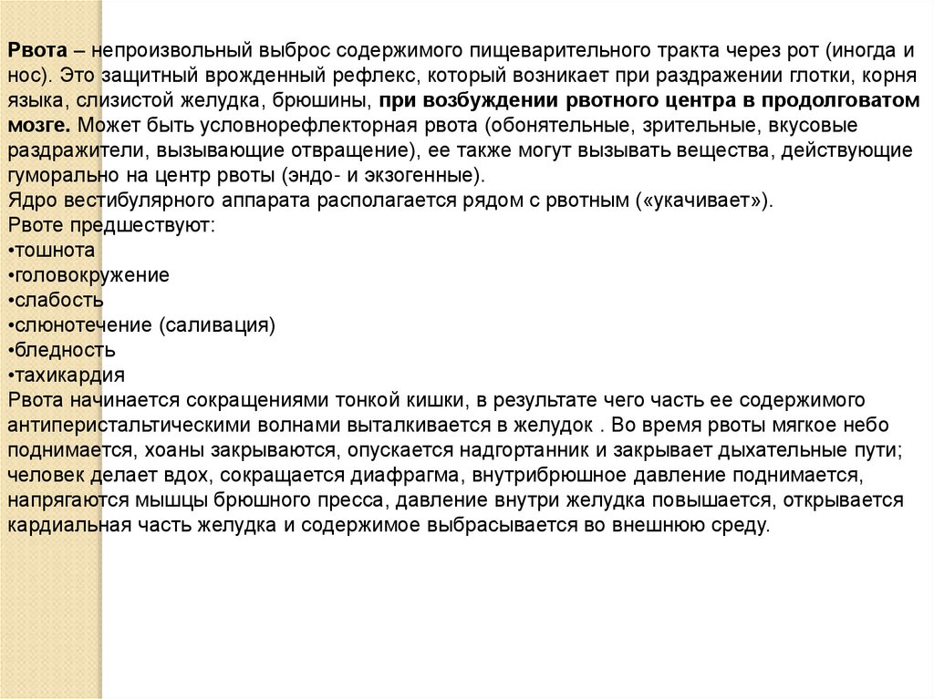 мозге. Может быть условнорефлекторная рвота (обонятельные, зрительные, вкусовые