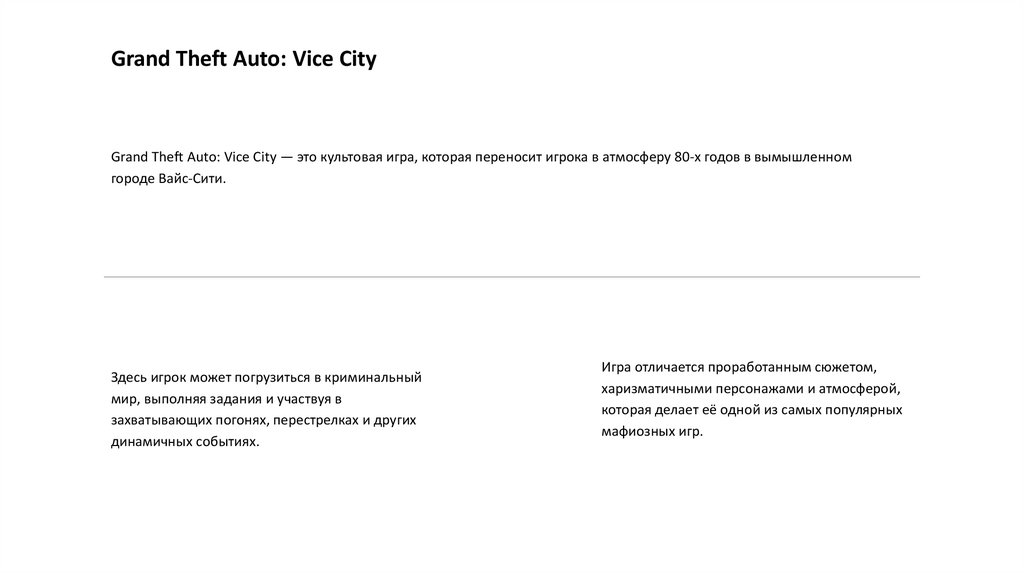 Grand Theft Auto: Vice CityGrand Theft Auto: Vice City — это культовая игра, которая переносит игрока в атмосферу 80-х годов в вымышленном