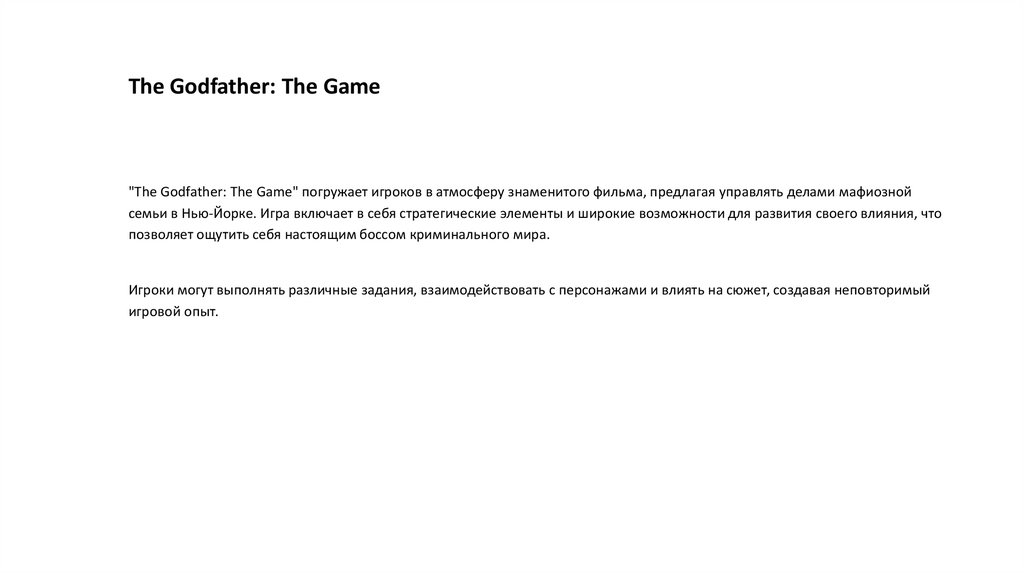 The Godfather: The Game"The Godfather: The Game" погружает игроков в атмосферу знаменитого фильма, предлагая управлять делами мафиозной