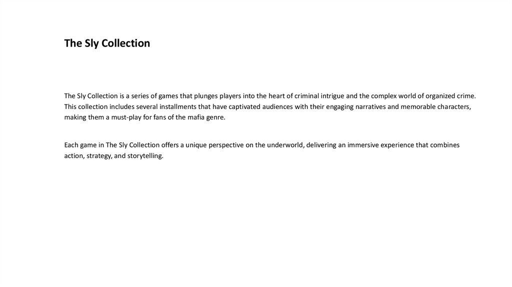 The Sly CollectionThe Sly Collection is a series of games that plunges players into the heart of criminal intrigue and the complex world of organized crime.