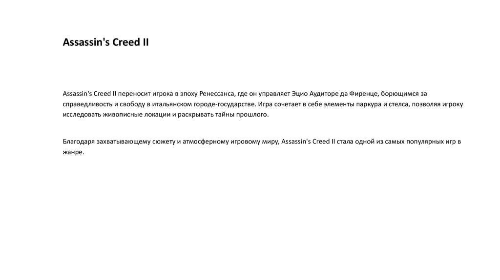 Assassin's Creed IIAssassin's Creed II переносит игрока в эпоху Ренессанса, где он управляет Эцио Аудиторе да Фиренце, борющимся за
