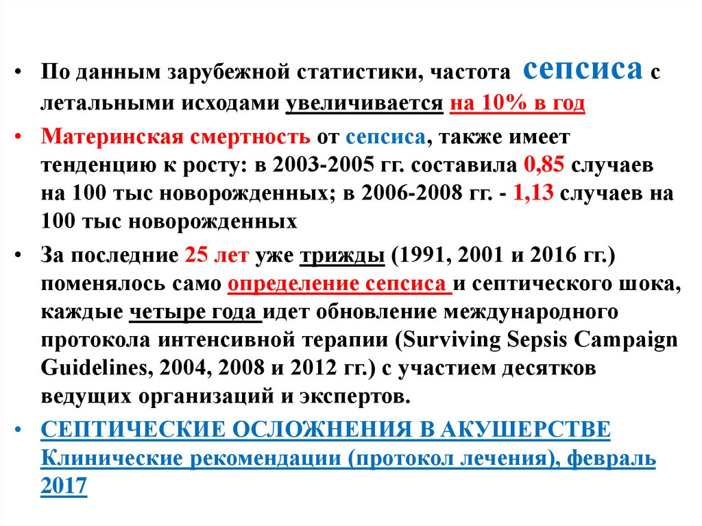 • По данным зарубежной статистики, частота сепсиса слетальными исходами увеличивается на 10% в год