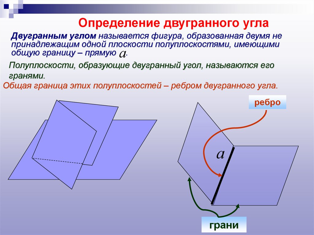 Определение двугранного углаДвугранным углом называется фигура, образованная двумя не