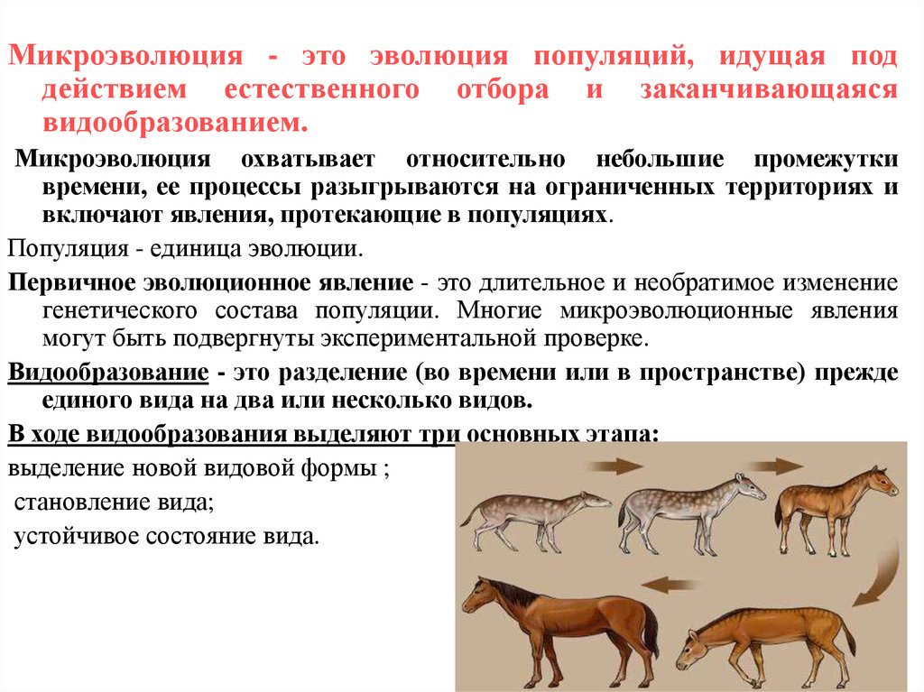 Микроэволюция - это эволюция популяций, идущая поддействием естественного отбора и заканчивающаяся