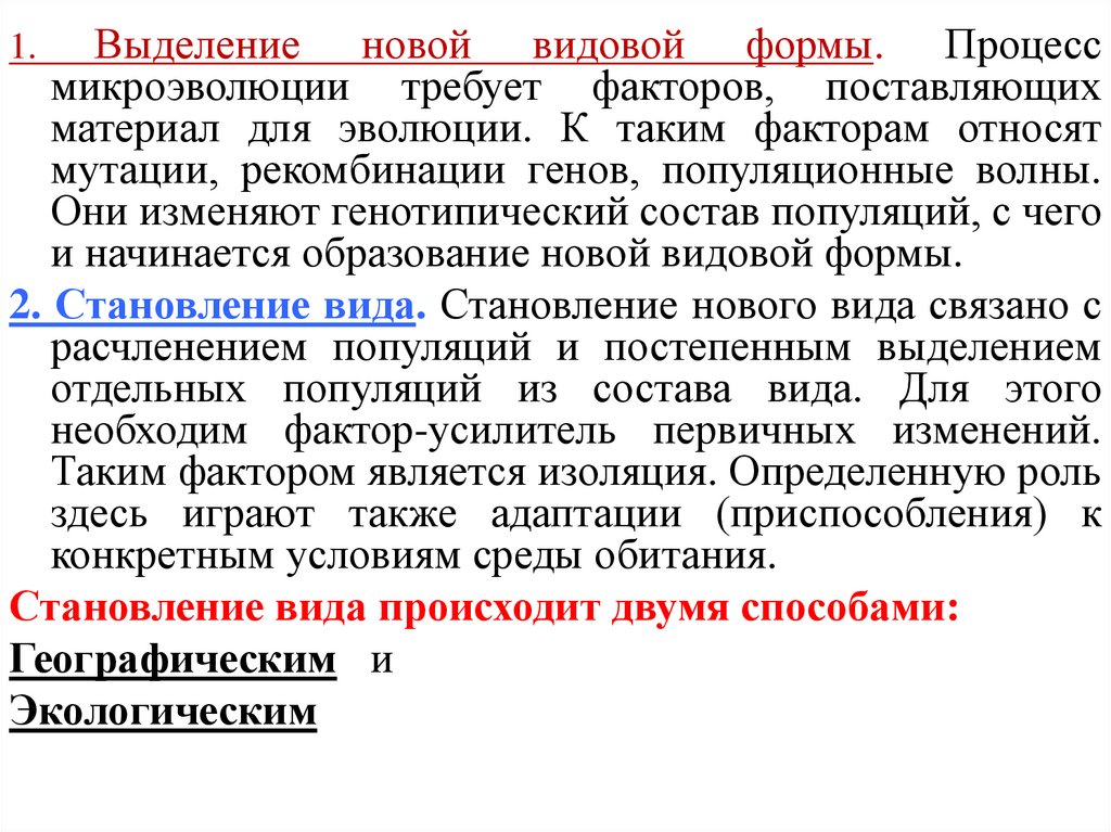 Выделение новой видовой формы. Процессмикроэволюции требует факторов, поставляющих