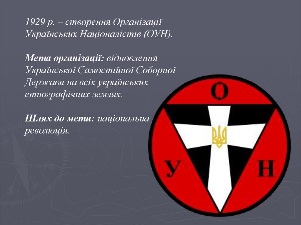 1929 р. – створення ОрганізаціїУкраїнських Націоналістів (ОУН).