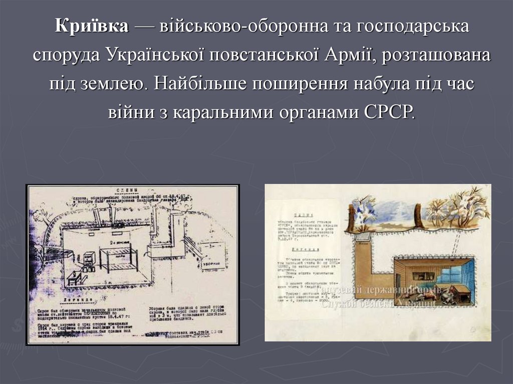 Криївка — військово-оборонна та господарськаспоруда Української повстанської Армії, розташована