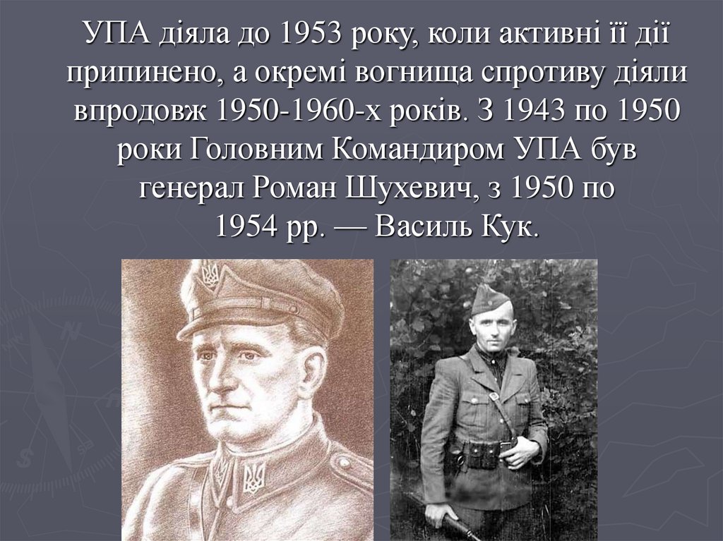 УПА діяла до 1953 року, коли активні її діїприпинено, а окремі вогнища спротиву діяли