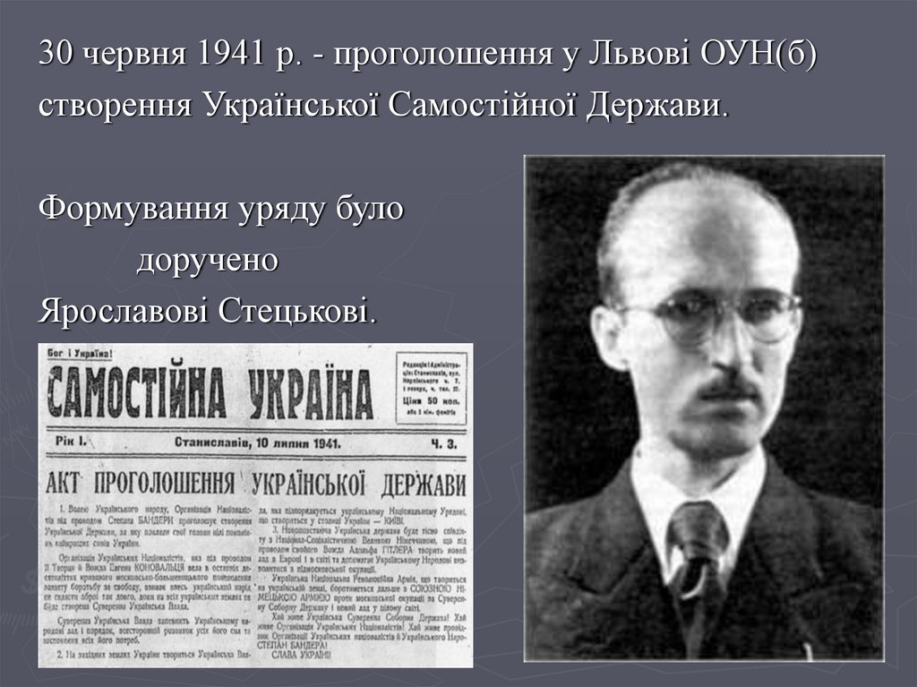 30 червня 1941 р. - проголошення у Львові ОУН(б)створення Української Самостійної Держави.