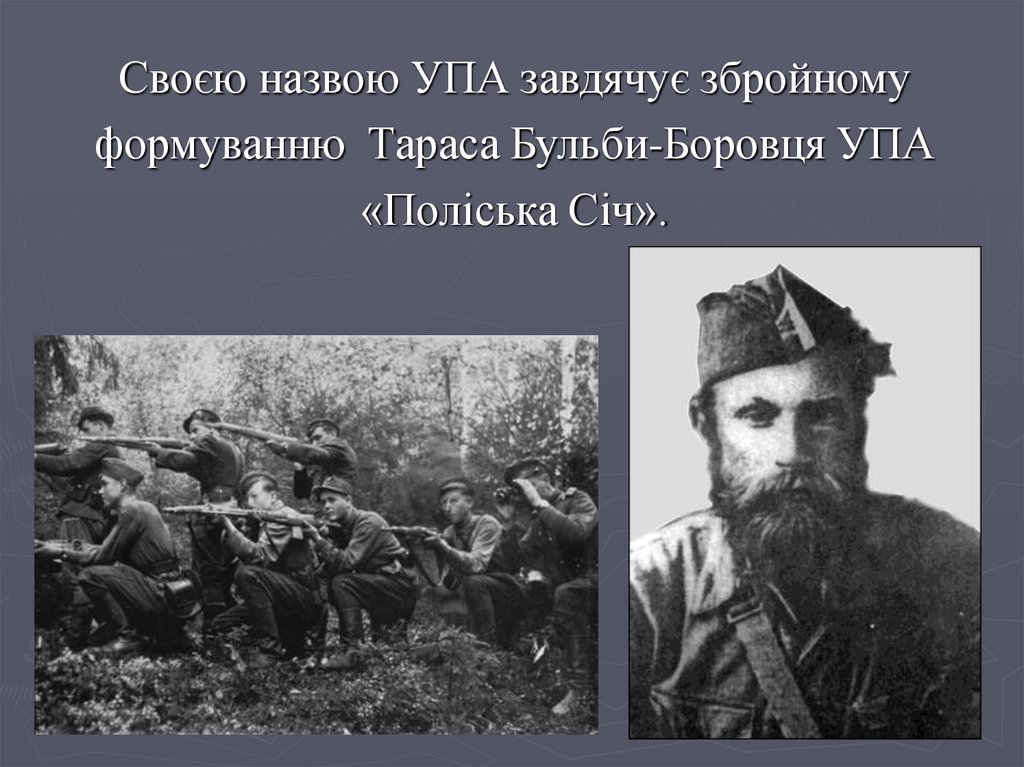 Своєю назвою УПА завдячує збройномуформуванню Тараса Бульби-Боровця УПА