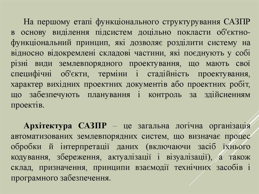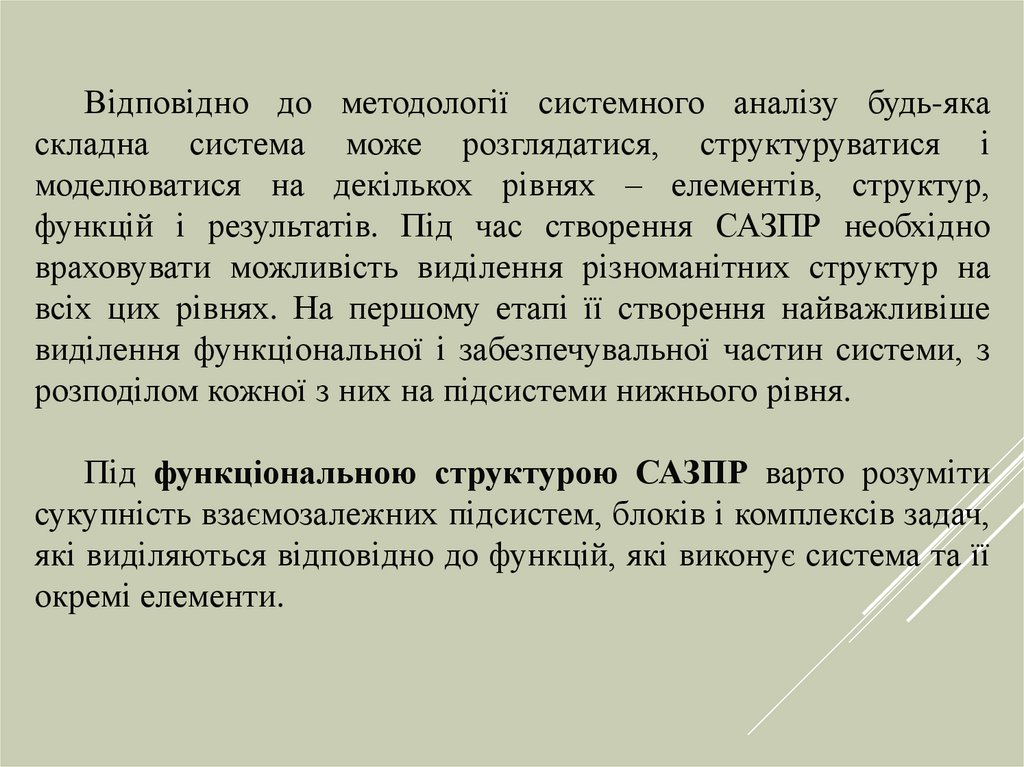 На першому етапі функціонального структурування САЗПРв основу виділення підсистем доцільно покласти об'єктнофункціональний принцип, які дозволяє розділити систему на