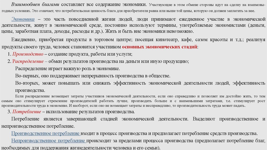 Взаимообмен благами составляет все содержание экономики. Участвующие в этом обмене стороны идут на сделку на взаимовыгодных условиях. Это означает, что потребительская ценность блага для приобретателя равна или выше той цены, которую он должен заплатить за нее.Экономика – это часть повседневной жизни людей, люди принимают ежедневное участие в экономической