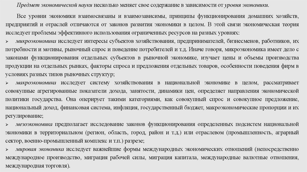 Предмет экономической науки несколько меняет свое содержание в зависимости от уровня экономики.Все уровни экономики взаимосвязаны и взаимозависимы, принципы функционирования домашних хозяйств,