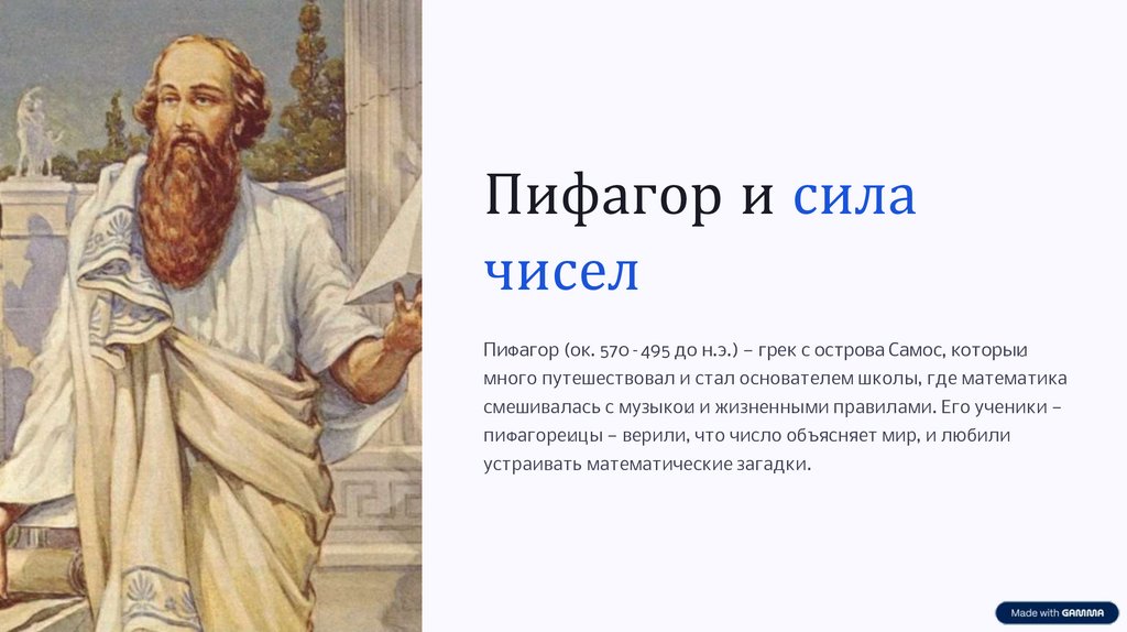 Пифагор (ок. 570–495 до н.э.) — грек с острова Самос, который