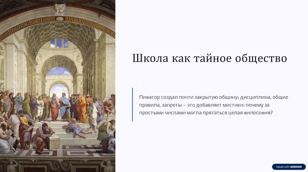 Школа как тайное обществоПифагор создал почти закрытую общину: дисциплина, общие