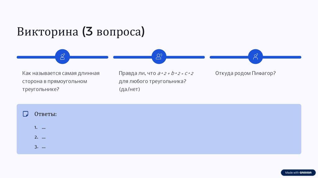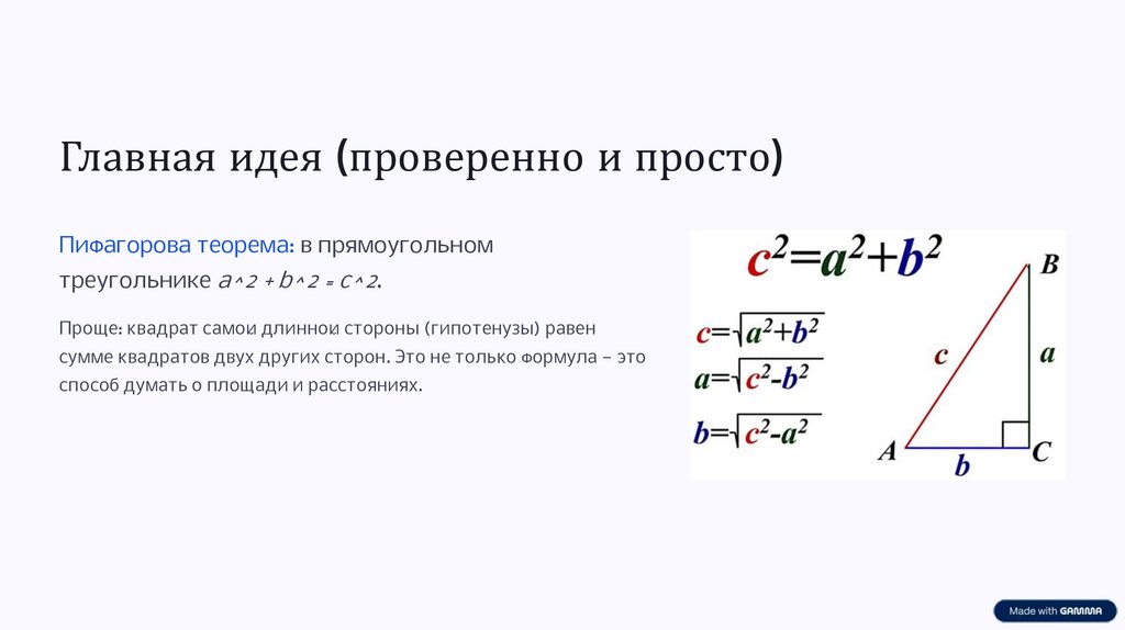 Главная идея (проверенно и просто)Пифагорова теорема: в прямоугольном
