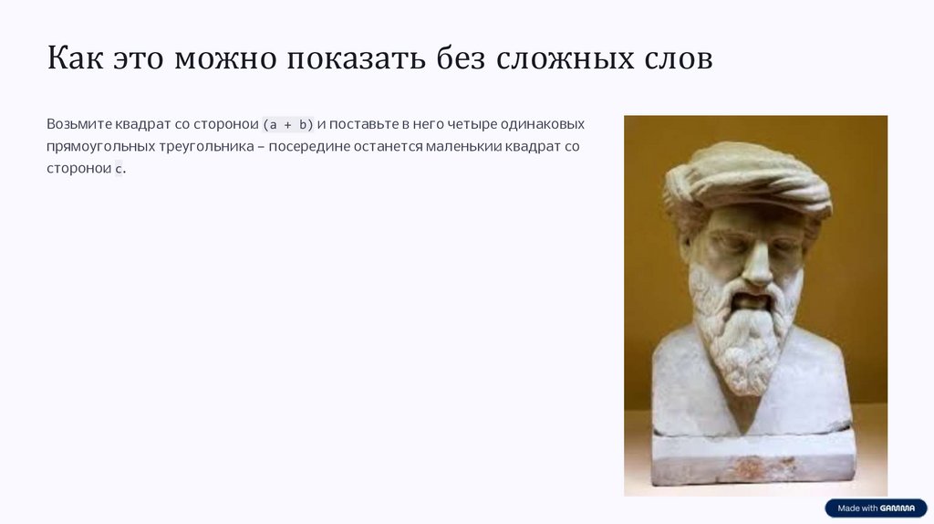 Как это можно показать без сложных словВозьмите квадрат со стороной (a + b) и поставьте в него четыре одинаковых