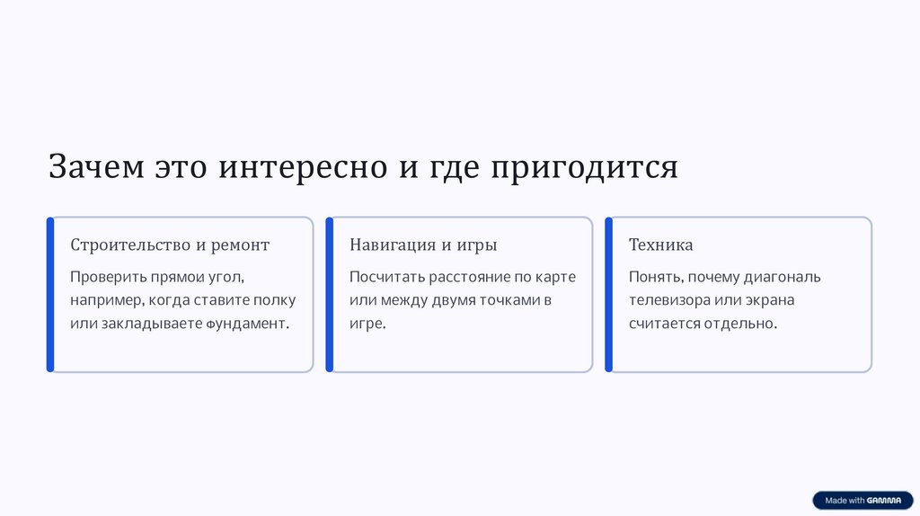 сумме квадратов двух других сторон. Это не только формула — это