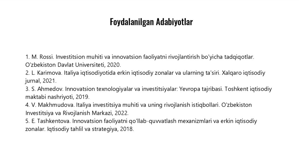 Foydalanilgan Adabiyotlar1. M. Rossi. Investitsion muhiti va innovatsion faoliyatni rivojlantirish bo'yicha tadqiqotlar.