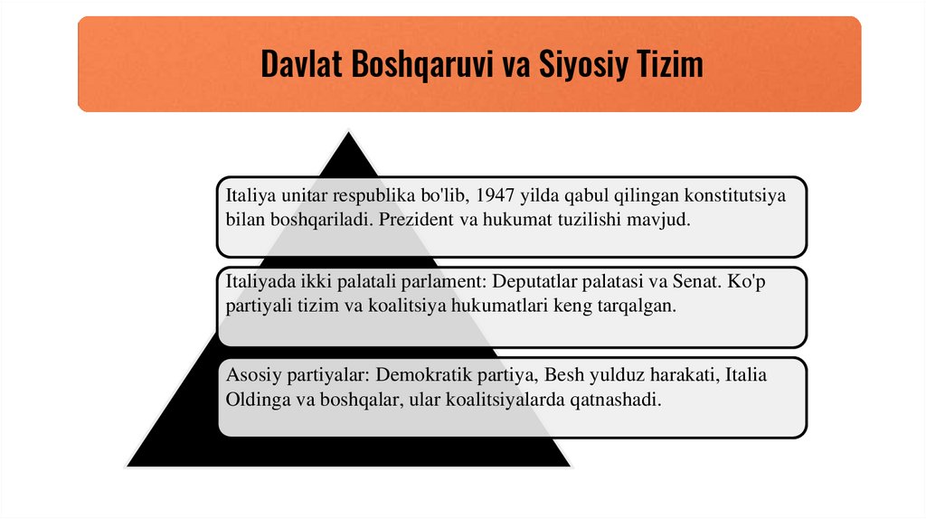 Davlat Boshqaruvi va Siyosiy TizimItaliya unitar respublika bo'lib, 1947 yilda qabul qilingan konstitutsiya