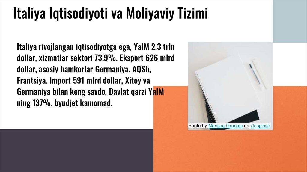 Italiya Iqtisodiyoti va Moliyaviy TizimiItaliya rivojlangan iqtisodiyotga ega, YaIM 2.3 trln