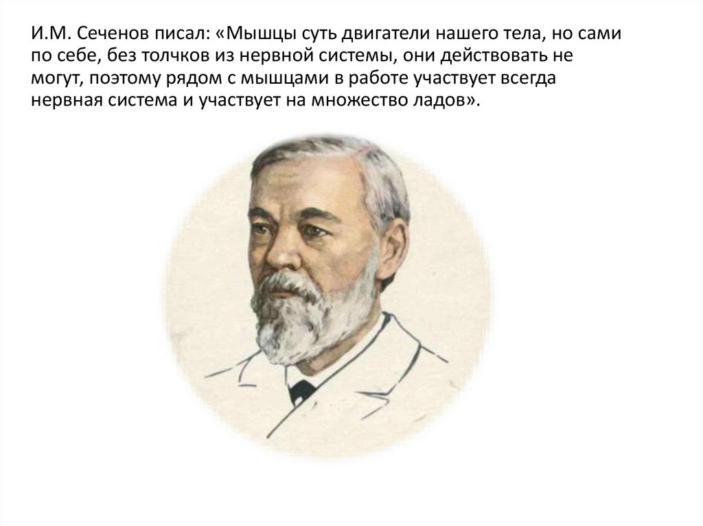 И.М. Сеченов писал: «Мышцы суть двигатели нашего тела, но самипо себе, без толчков из нервной системы, они действовать не