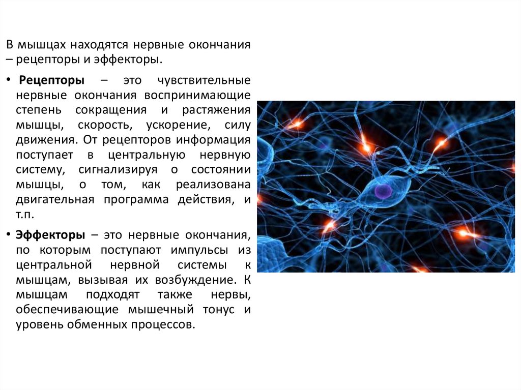В мышцах находятся нервные окончания– рецепторы и эффекторы.