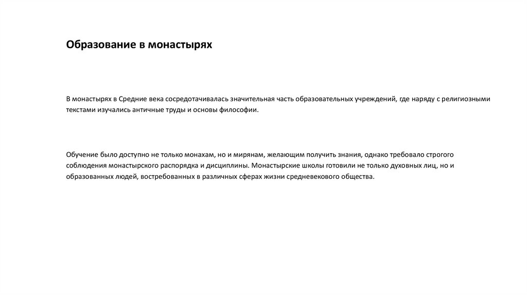 Образование в монастыряхВ монастырях в Средние века сосредотачивалась значительная часть образовательных учреждений, где наряду с религиозными