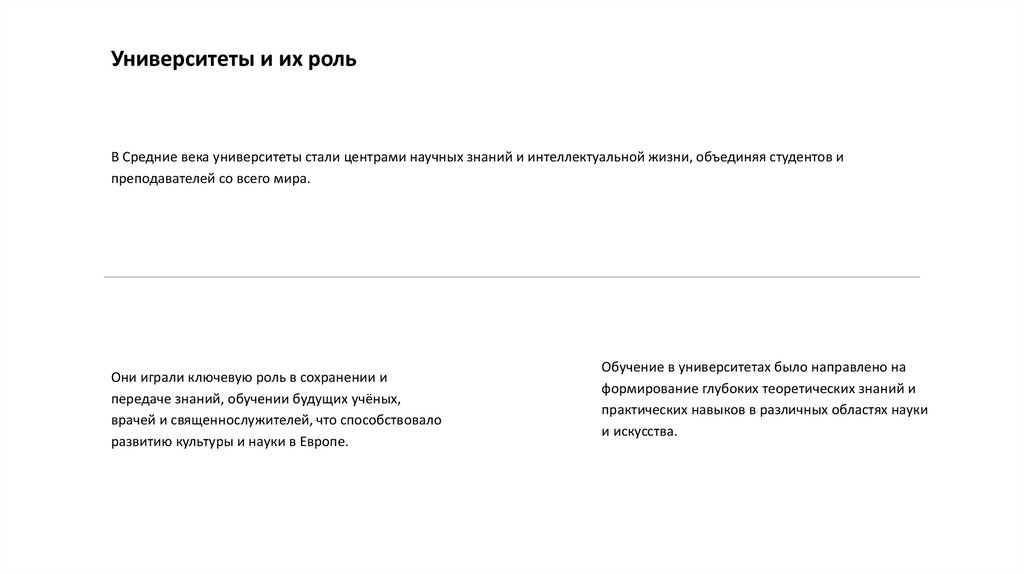 Университеты и их рольВ Средние века университеты стали центрами научных знаний и интеллектуальной жизни, объединяя студентов и