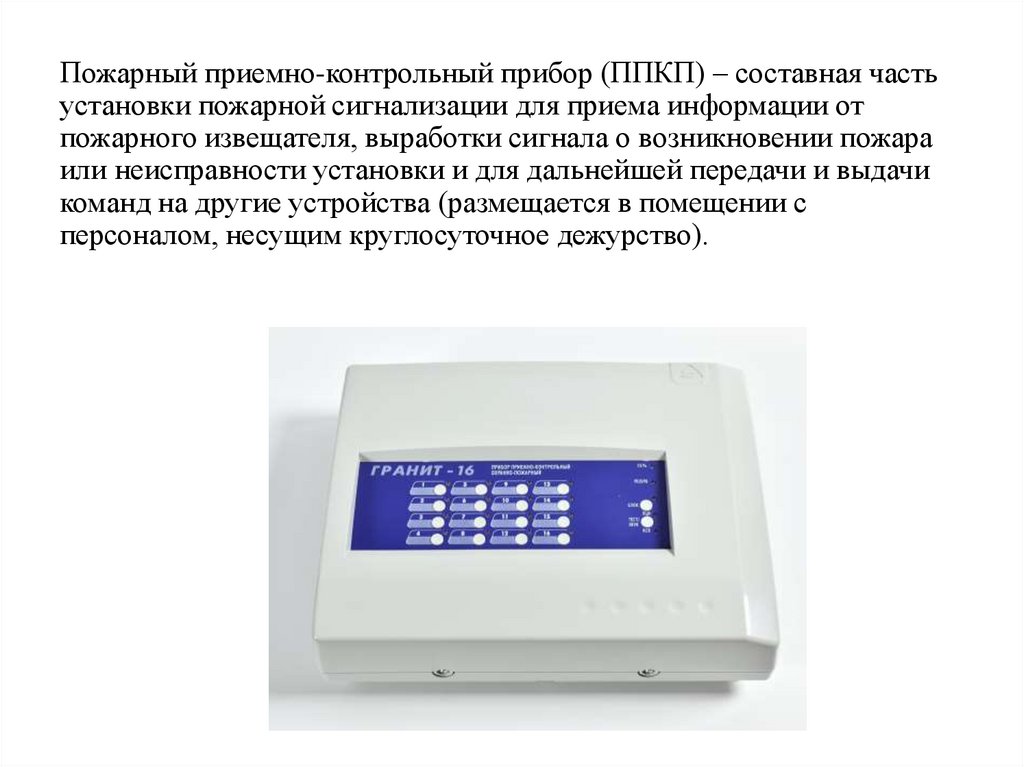 Пожарный приемно-контрольный прибор (ППКП) – составная частьустановки пожарной сигнализации для приема информации от