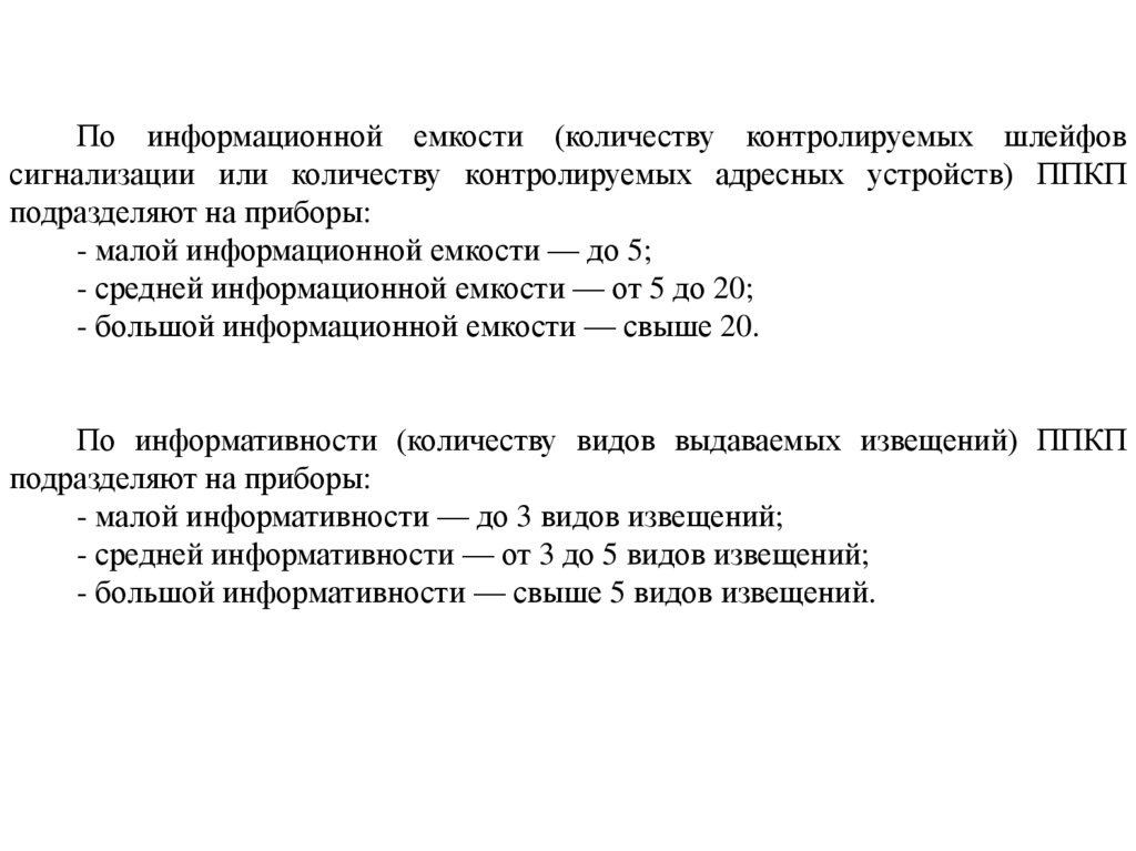 По информационной емкости (количеству контролируемых шлейфовсигнализации или количеству контролируемых адресных устройств) ППКП