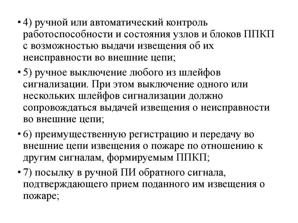 • 4) ручной или автоматический контрольработоспособности и состояния узлов и блоков ППКП