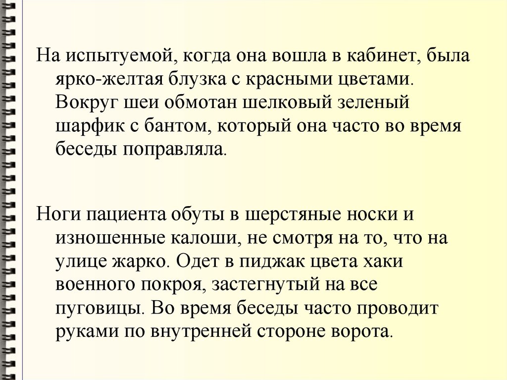 На испытуемой, когда она вошла в кабинет, былаярко-желтая блузка с красными цветами.