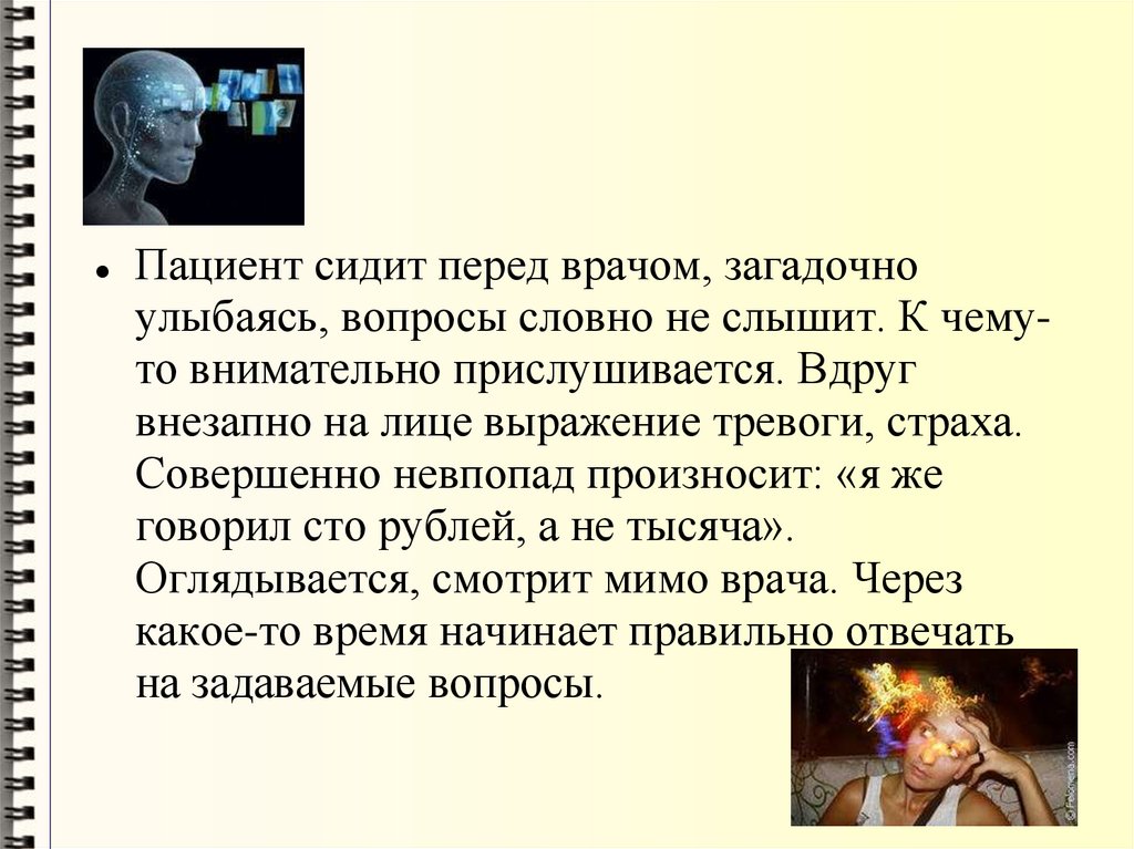 Пациент сидит перед врачом, загадочноулыбаясь, вопросы словно не слышит. К чемуто внимательно прислушивается. Вдруг