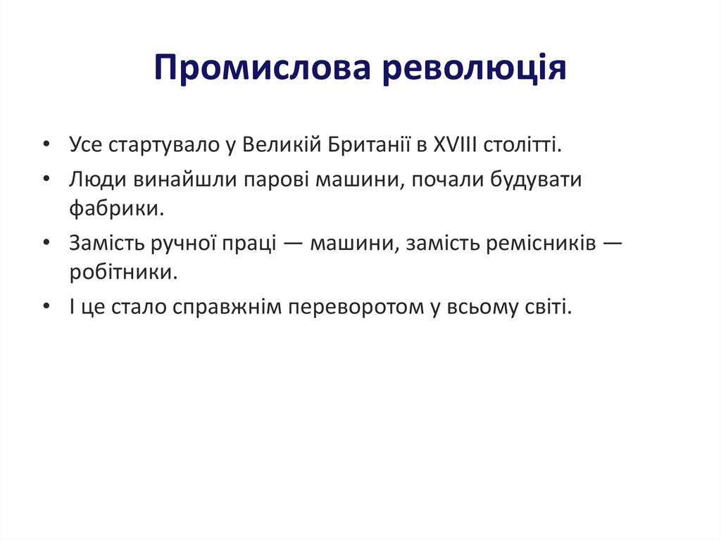 • Замість ручної праці — машини, замість ремісників —