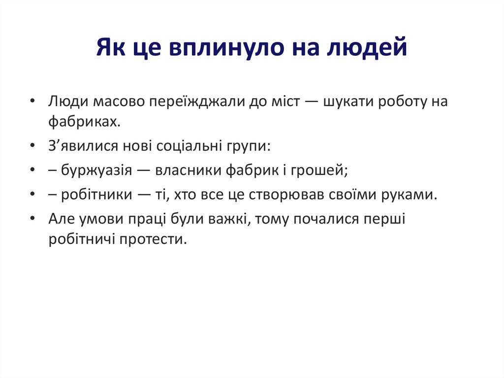 Як це вплинуло на людей• Люди масово переїжджали до міст — шукати роботу на