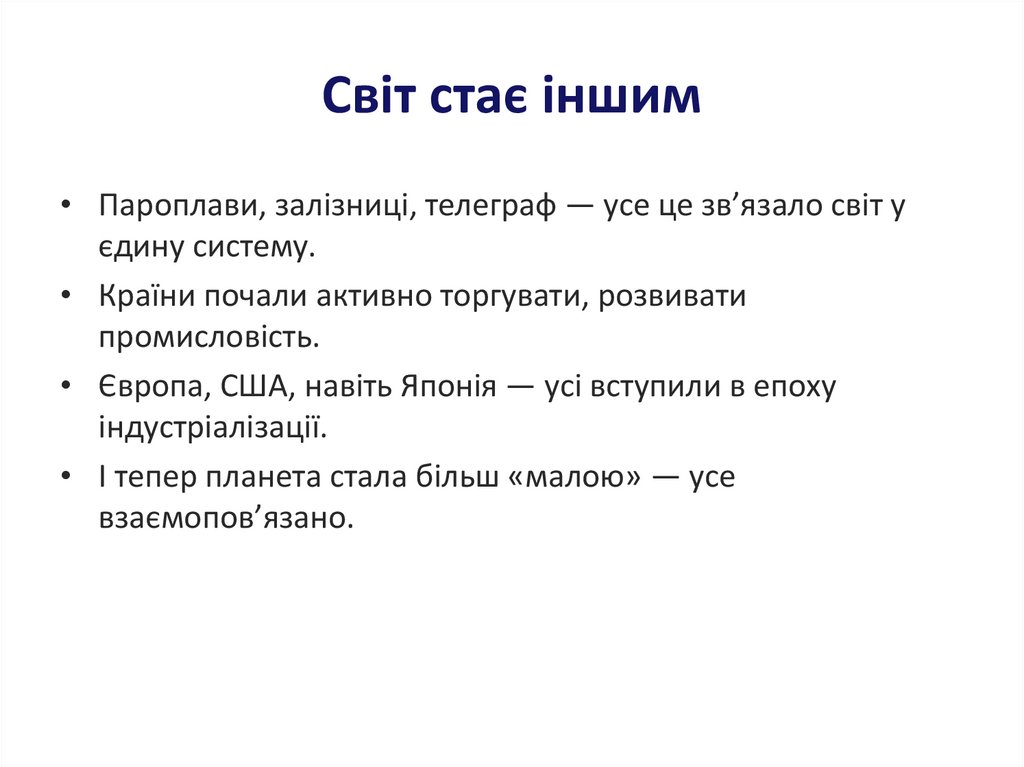 Світ стає іншим• Пароплави, залізниці, телеграф — усе це зв’язало світ у