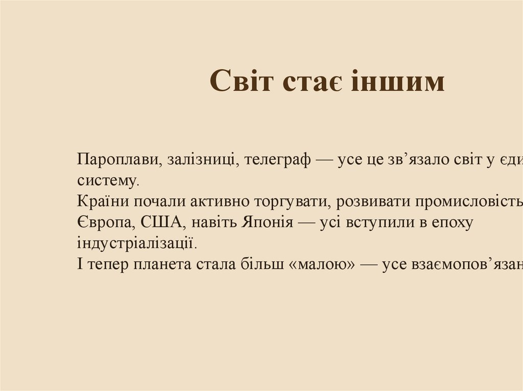 Світ стає іншимПароплави, залізниці, телеграф — усе це зв’язало світ у єди