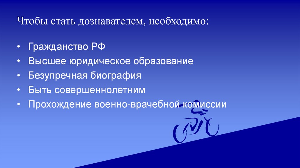 Чтобы стать дознавателем, необходимо:Гражданство РФ