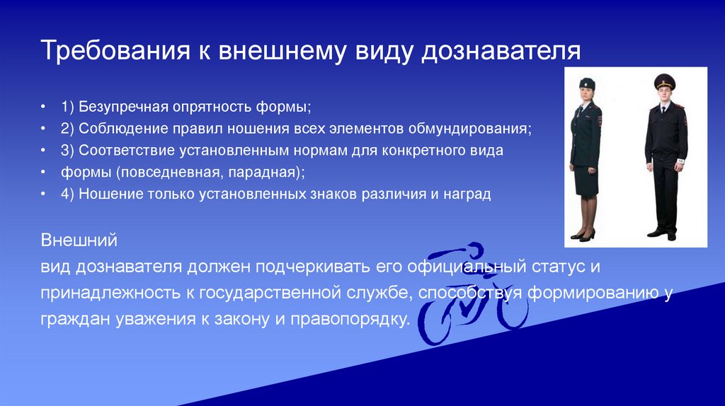 Требования к внешнему виду дознавателя1) Безупречная опрятность формы;