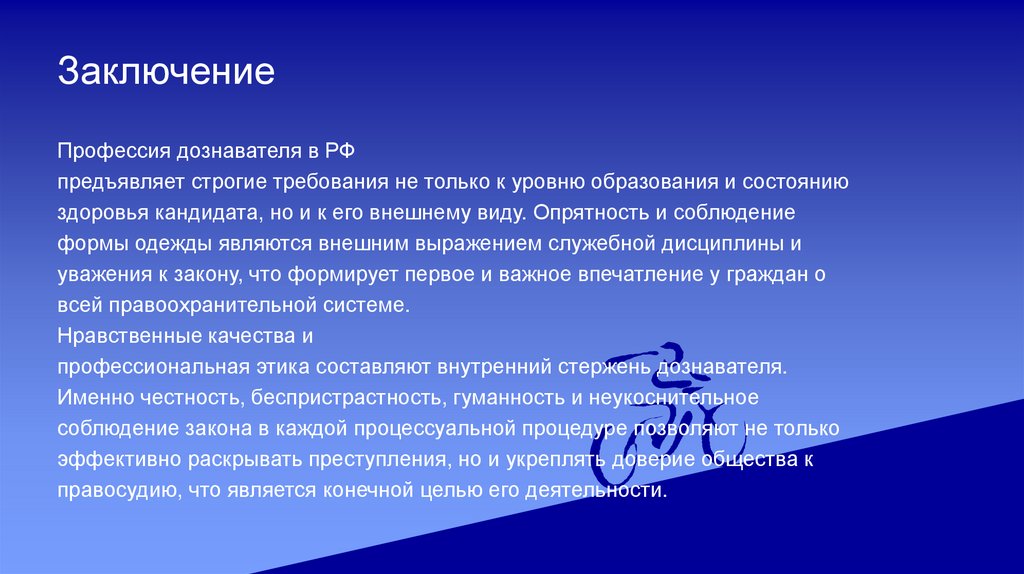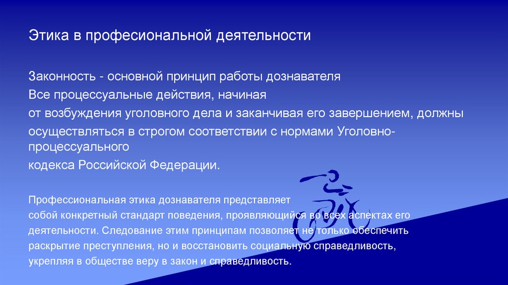 Этика в професиональной деятельностиЗаконность - основной принцип работы дознавателя