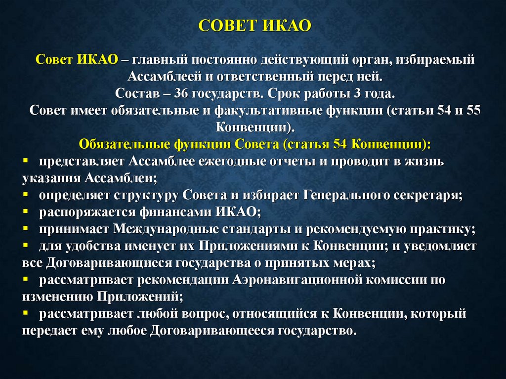 СОВЕТ ИКАОСовет ИКАО – главный постоянно действующий орган, избираемый
