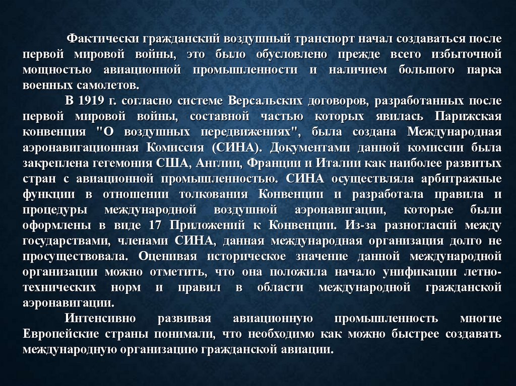 Фактически гражданский воздушный транспорт начал создаваться послепервой мировой войны, это было обусловлено прежде всего избыточной